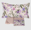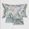 Le federe a quattro volanini e l'alta balza del lenzuolo sono in raso 300TC stampato in digitale. Tutto il resto del completo è in percalle di puro cotone tinta unita.